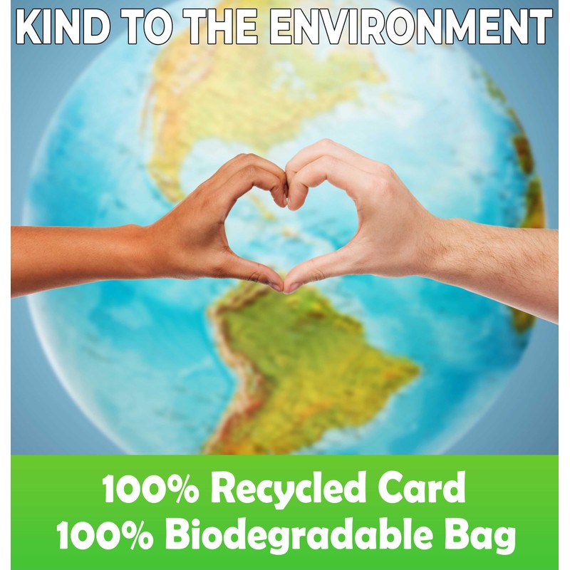 - ECO FRIENDLY: We only use 100% Recycled Card and Paper and a compostable bag for protection.