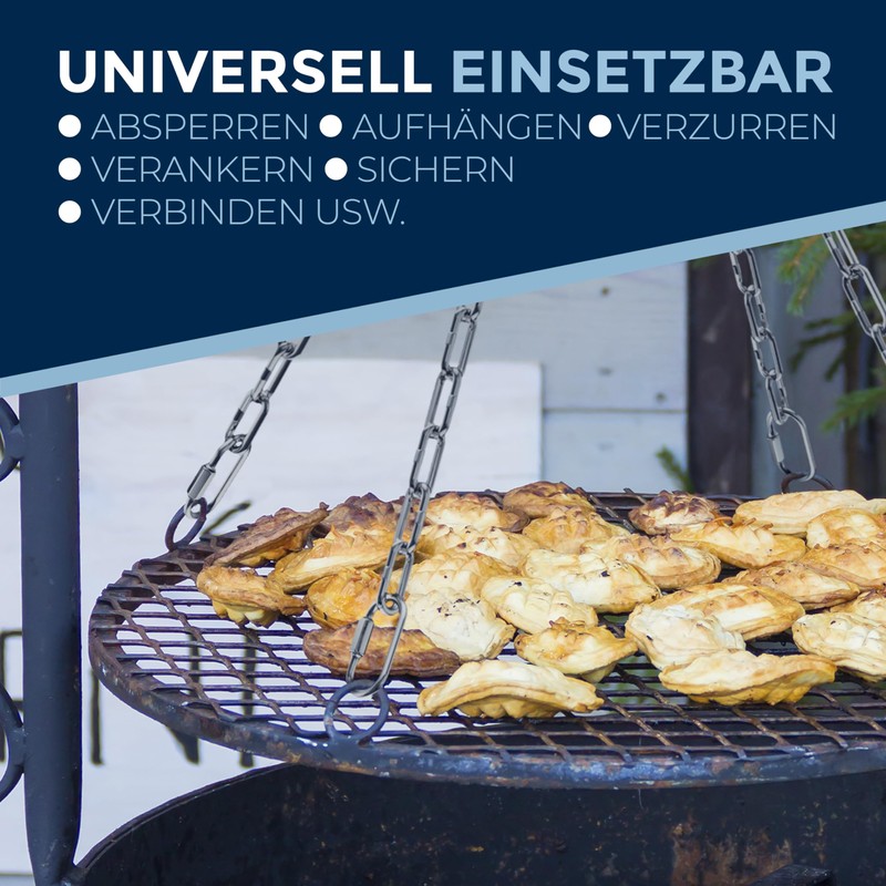• 1 stainless steel chains, 2 screw connectors, 2 round shackles in one set. All components made of high-alloy stainless steel V4A rust-proof