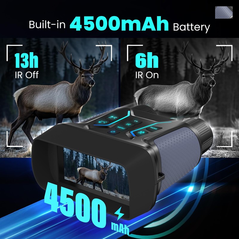 • ๐‹๐จ๐ง๐ -๐‹๐š๐ฌ๐ญ๐ข๐ง๐  ๐๐š๐ญ๐ญ๐ž๐ซ๐ฒ ๐‹๐ข๐Ÿ๐ž: With a 4500mAh rechargeable battery, enjoy up to 13 hours of continuous use with the IR off and up to 6 hours with infrared on, making it a reliable choice for digital night vision enthusiasts during nighttime adventures.
