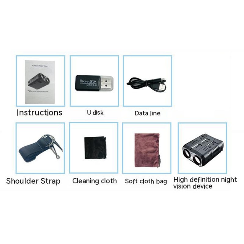 - 【WHAT WE GET】Night Vision Instrument x 1,USB flash disk x 1,32G TF card x 1,Charging line x 1, Instruction x 1,Storage bag x 1,Shoulder strap x 1.
