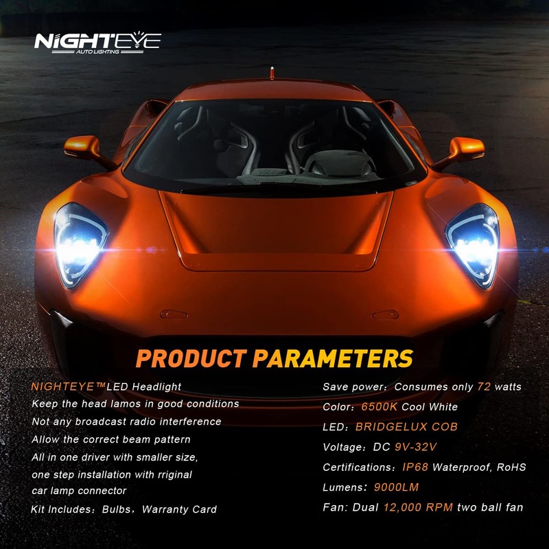 - 【+500% lifetime over】The NIGHTEYE 9000LM H11 bulb With advanced vacuum cooling duct, 46 heat sink fins and 12000 rpm cooling fan which perfectly channel the heat generated by the LED and keep the LED bulb at a touchable temperature at all times.The life of led bulbs can reach 50000+hours.