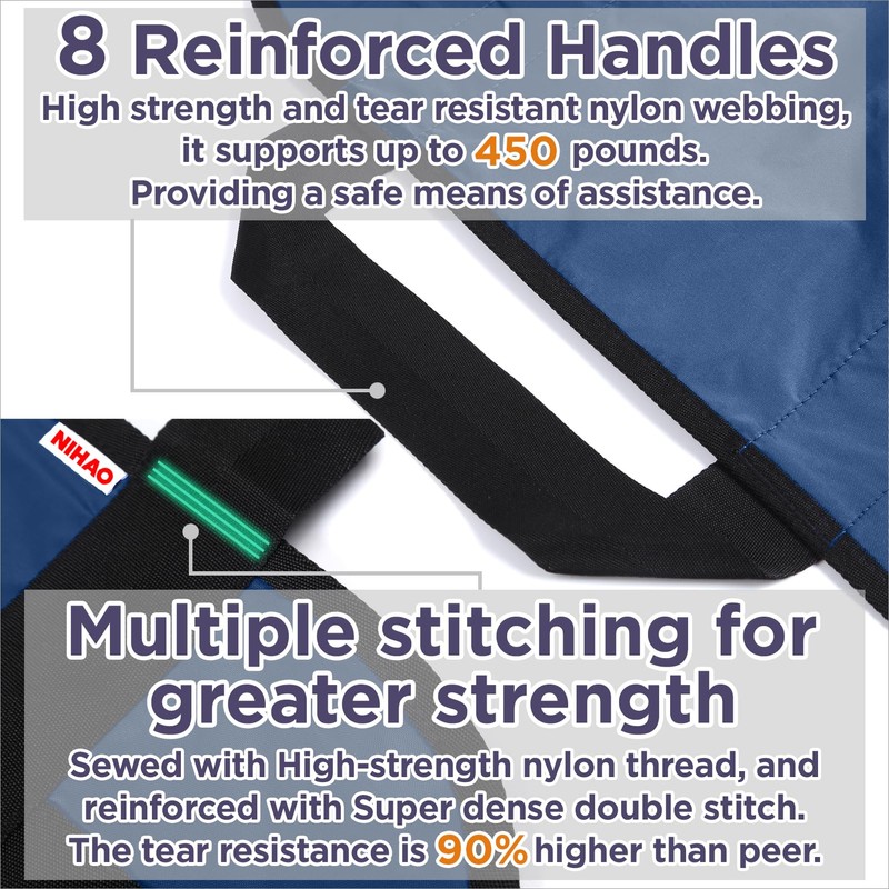 SAFELY LIFT AND REPOSITION ► High quality durable nylon fabric and reinforced handles construction provide a safe means of assistance. NIHAO positioning bed pad comfortably supports the heaviest parts of the body during repositioning, greatly reducing the risk of injury to care recipients. The transfer pad supports up to 400 lbs.