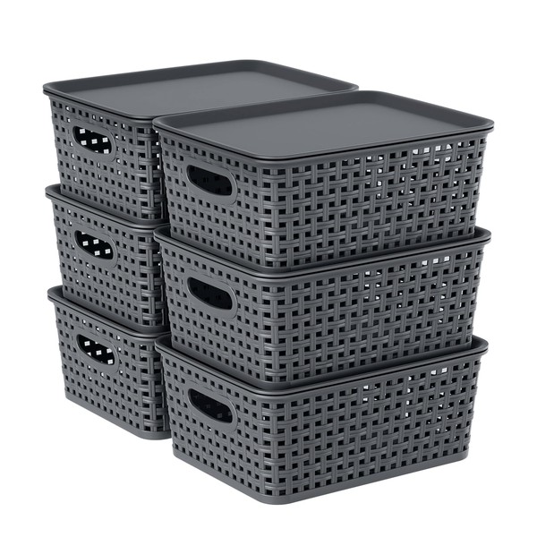 Nihenok 6 Pack Plastic Weave Storage Organizer Baskets with Lid, Woven Basket for Shelves, Grey