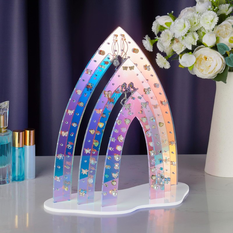 NiHome 160-Hole Acrylic Earring Holder Rack for 80 Pairs, Multi-Layer Arches Display Stand for Studs and Drop Earrings, Tool-Free Assembly Jewelry Organizer with Anti-Slip Stable Base (Iridescent)