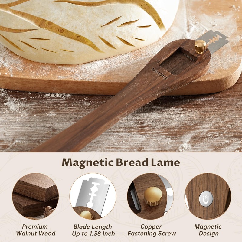 NiHome Bread Lame with Long Walnut Wood Handle for Scoring Bread and Slicing Dough, Safe Use with Push-Pull Locking Blade and Magnetic Back for Easy Storage, Ergonomic Grip for Precision Cutting