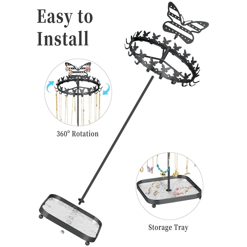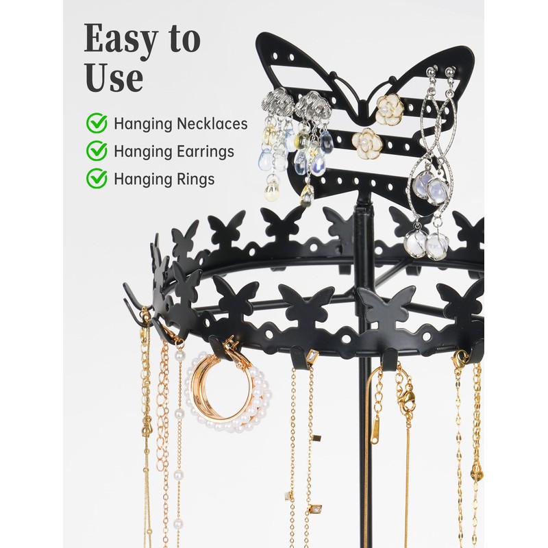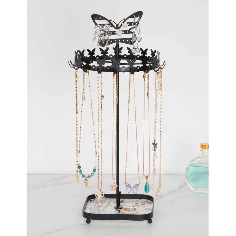 - Premium Materials, Durable and Long-lasting: This rotating necklace organizer is crafted from high-quality metal and plastic, ensuring a sturdy and durable structure that withstands long-term use. With its elegant butterfly design, it is both classic and fashionable, making it the ideal choice for storing earrings and necklaces, perfectly elevating your jewelry display.
