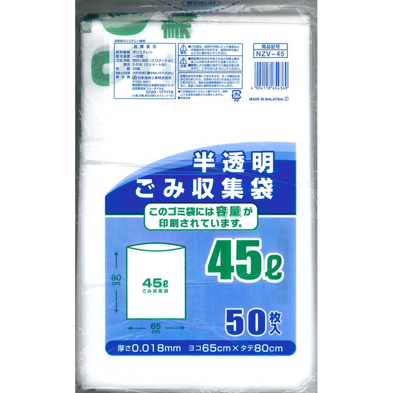 Nihon Giken Kogyo NZV-45 Trash Bags, Translucent, 1.1 gal (45 L), Thickness: 0.0007 inches (0.018 mm), Recommended Trash Bags, 23 Wards Old Recommended Trash Bags, Thin but Durable, Capacity Notation Included, Pack of 50