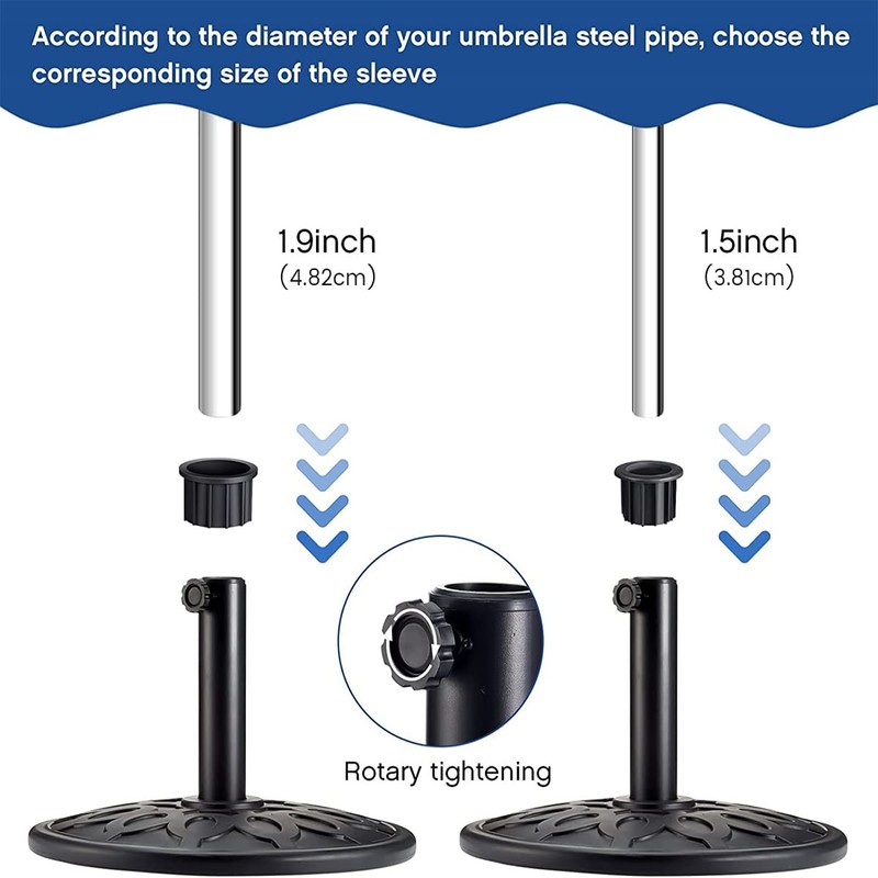 - [Size Information] The package includes 4pcs umbrella stand in 2 different sizes, which can fit 1.5 inch and 1.9 inch diameter of umbrella pole. Please measure your umbrella pole diameter to make sure this stand will fit.