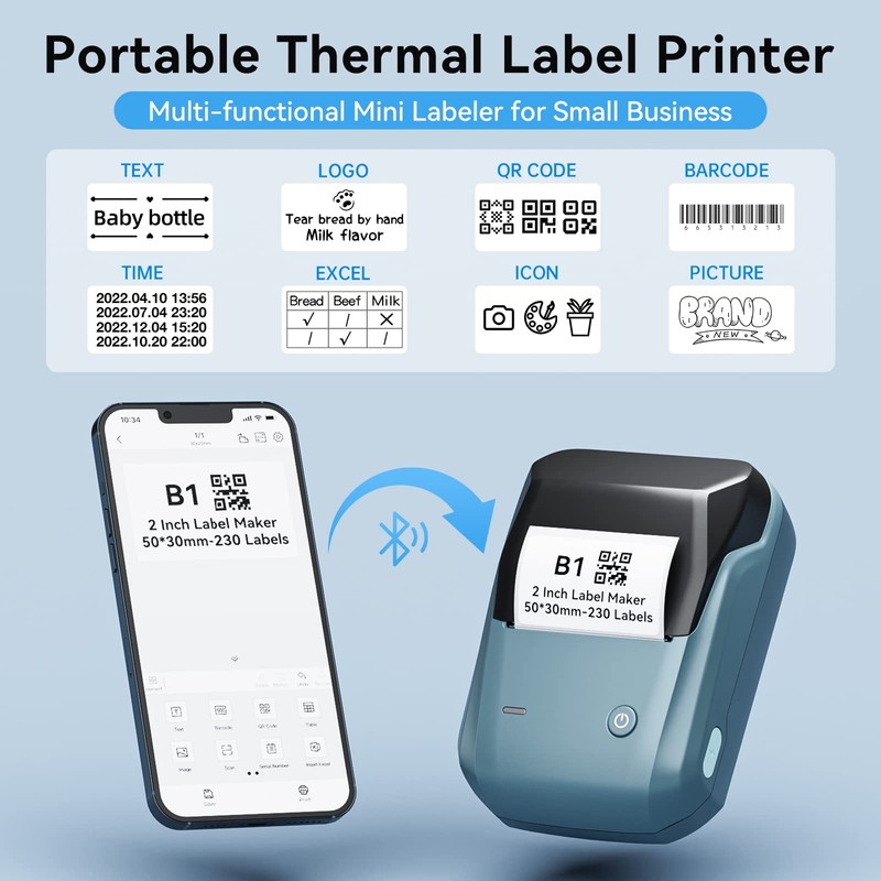 NIIMBOT Barcode Label Printer B1 Label Printer for Small Business, Bluetooth Label Maker with Tape, Address Label Maker for Mailing, Business & Shipping Labels, Compatible with Phone & Computer Trusty Brand: The B1 label maker comes with 1 roll 230pcs 2 x 1.2 inch labels, Type-C charging cable and instruction manual. One-click connect and printing with stable bluetooth connection, A good assistant during Back to School, New Year Eve, Thanksgiving, and Christmas. Multifunctional APP: This label maker uses exclusive mobile APP to edit, you need to download the NIIMBOT App before printing, the free app provides a variety of free templates, allows you to import label text from Excel files, supports printing various texts, numbers, graphics, symbols, logos, barcodes, QR codes Label, etc. Customized your own label just in a second through your phone.