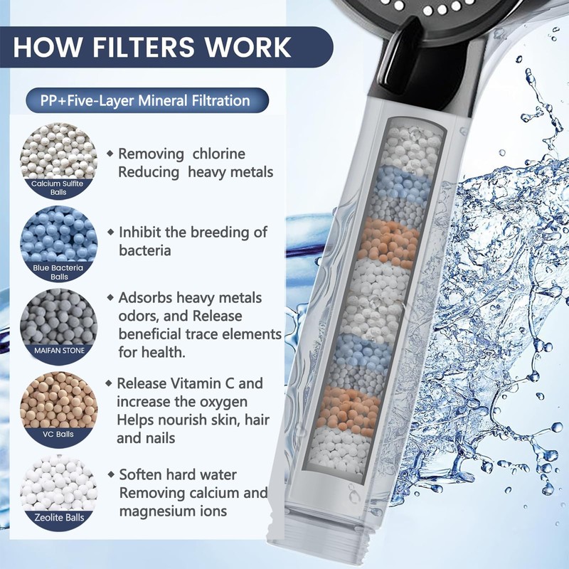 - 【SLEEK MINIMALIST DESIGN】Elevate your bathroom decor with the stylish round shape and matte black finish. The minimalist aesthetic of this filter showerhead adds a modern touch to any bathroom space.