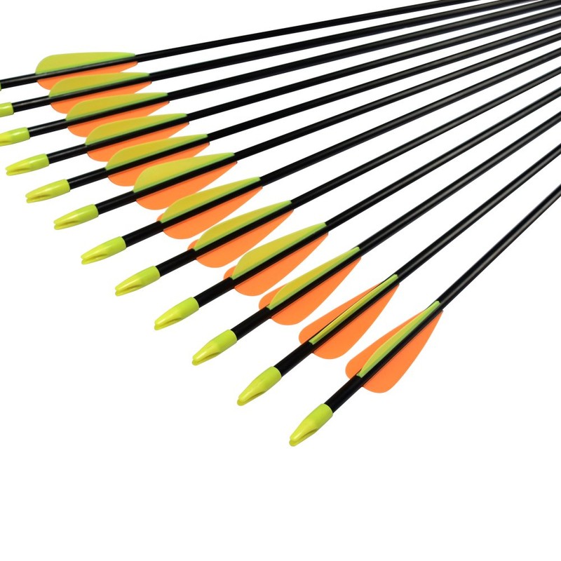 **Quantity:** 12 pcs/lot **Shaft Material:** Fiberglass **Shaft Size:** 5mm(I.D.), 7mm(O.D.) **GPI:** 14.66 grains/inch **Vane:** 3 inch TPU Streamline Vanes(1 Yellow 2 Orange) **Points:** 6875 Bullet Point **Nock:** 6875 Plastic Yellow Nock **Suitable for:** Compoundbow and Recurvebow