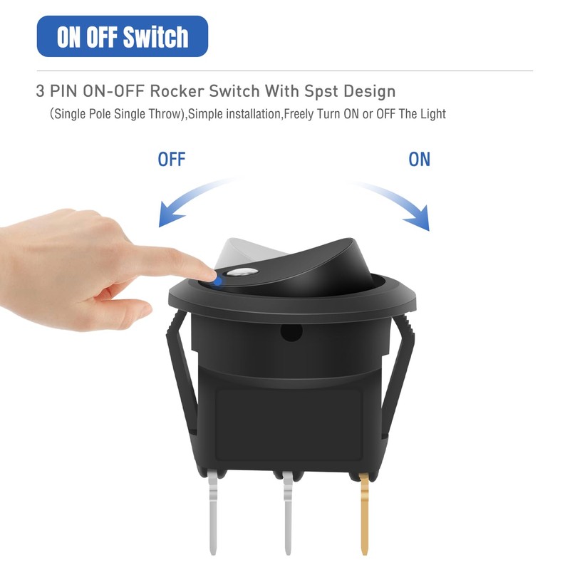 - Unique Design: Designed to connect and disconnect a DC12V 20A electrical circuit at will, SPST: ON-OFF control; 2 pole design (On/Off), 3rd poles with LED to be connected to earth. Fluorescent lamps will be lighted up when the switch is turned on