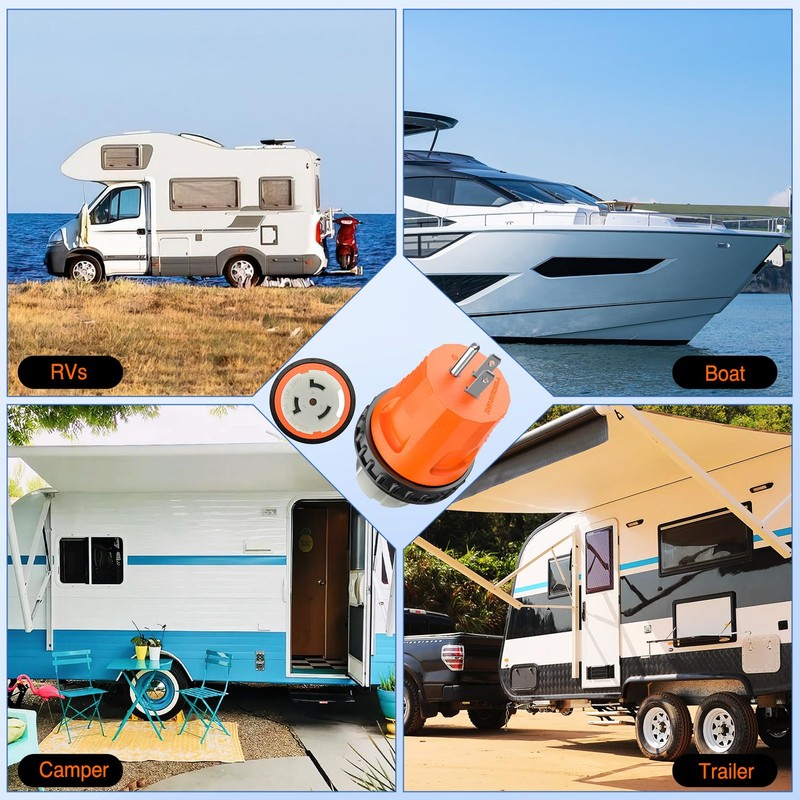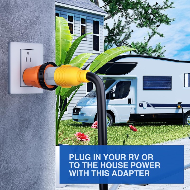 • 15 to 50 Amp Adapter: Allows you to connect on the 15 AMP female plug on the electric generator, or a 15 AMP external receptacle at RV Park or Campground to a 50 AMP service on your RV, which quickly supplies power for the refrigerator, air conditioner, microwave oven, roaster and other household appliances.
