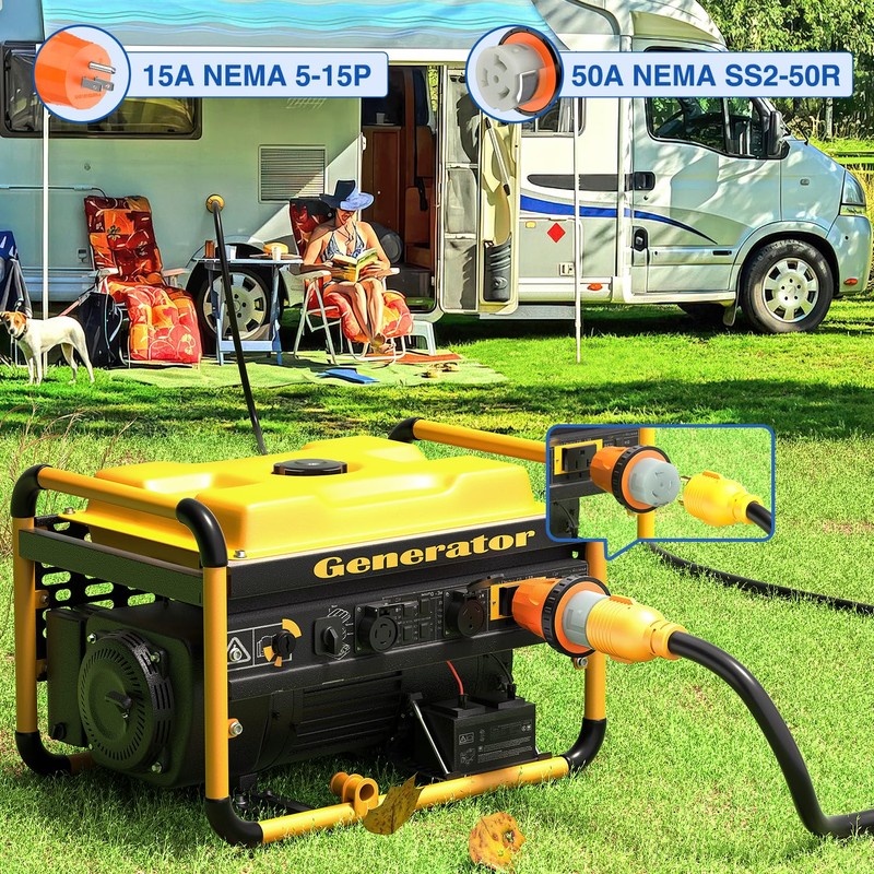 • Electrical Rating: Rated for 110 Volts. The 15 Amp (NEMA 5-15P) male to 50 Amp (NEMA SS2-50R) female heavy duty power adapter. Molded and made of pure copper, ensuring high conductivity and a solid, safe construction for use on electric generator or power supplies for household appliances on your RV .