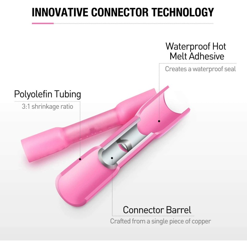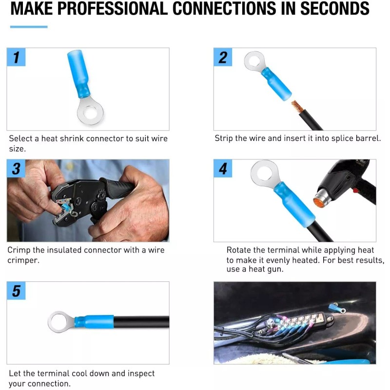 - 【Ease of Application】:Strip wire insulation, crimp terminal barrel with a wire crimper, and apply heat with a heat gun while rotating a connector. Heat shrink tubing will reduce in size and adhere to the wire. No soldering kit needed. Start making secure and durable connections in seconds.