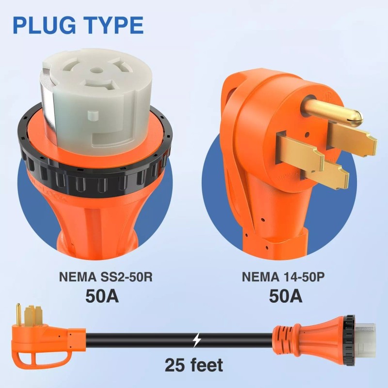 • Plug Type: Male Plug: NEMA 14-50P; Female Plug: NEMA SS2-50R; Max loading: 50A 250V