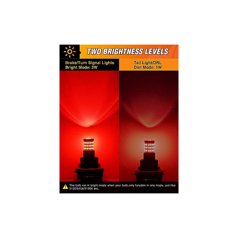 - Especificaciones: Chip LED: 54 piezas 3014 y 3 piezas 3030 SMD LED Color: rojo. Voltaje de funcionamiento: 12 V CC (máximo 18 V). Potencia de salida: 3 W en modo de alto brillo, 1 W en modo de bajo brillo. Lúmenes efectivos: 170 lm/PC Temperatura de trabajo: