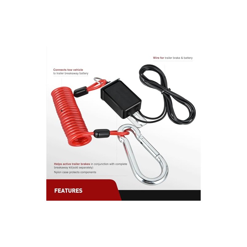 - Safe and Reliable: Replace your trailer breakaway device with this durable switch kit that features a coiled cord. Provides a safer and more effective connection to your trailer, because it doesn't rust, fray or become damaged while towing which keeps you and your trailer safer when towing.If the trailer becomes disconnected while towing, the cable is released and the brakes are engaged.