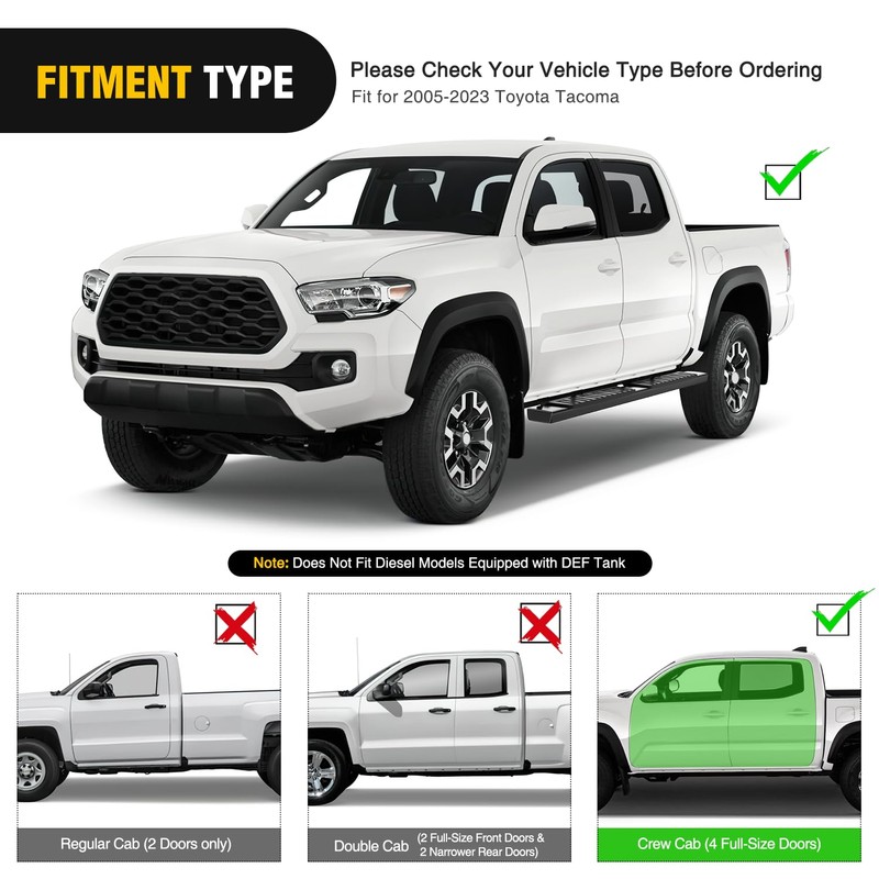 - 【FITMENT】- Fits with 2005-2023 Toyota Tacoma Double Cab 4 Full Size Doors(NOT for Access Cab with 2 full-size front doors & 2 suicided rear doors) . If you’re not sure what model you have, please check the cab size picture