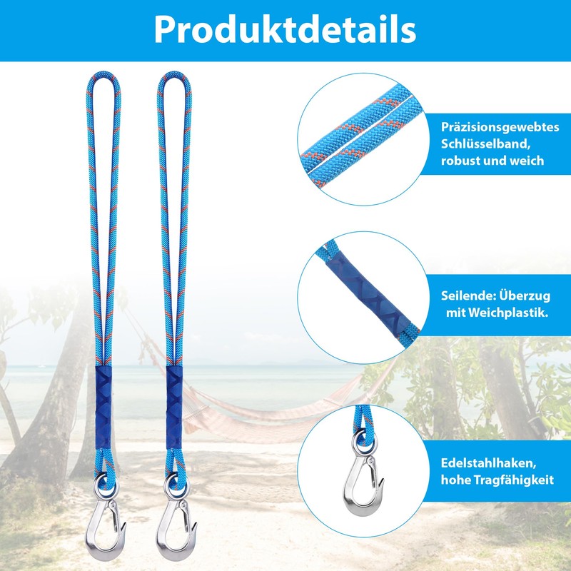 • Swing tree attachment rope kit: you will receive 2 swing attachments made of high-strength polyester with a length of 0.6 metres each, equipped with stainless steel hooks. It is a must for camping trips, beach holidays, backpacking adventures and picnics.