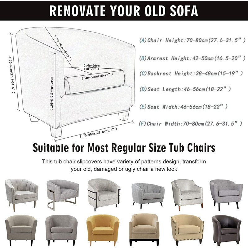 - Perfect Fit: Solve your size troubles. Tub chair slipcover fit the chair height: 70-80cm /27.6"-34.5"; Chair Width: 70-80cm /27.6"-31.5"; Cushion width: 46-56cm /18"-22". Kindly check measurement guide in the picture and measure your chairs before ordering.