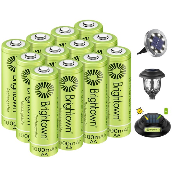 Brightown 12-Pack Rechargeable AA Batteries - 1000mAh 1.2V NiMH High Capacity Batteries - Ideal for Solar Lights & Home Devices, Recharge up to 1000x Times, Pre-Charged