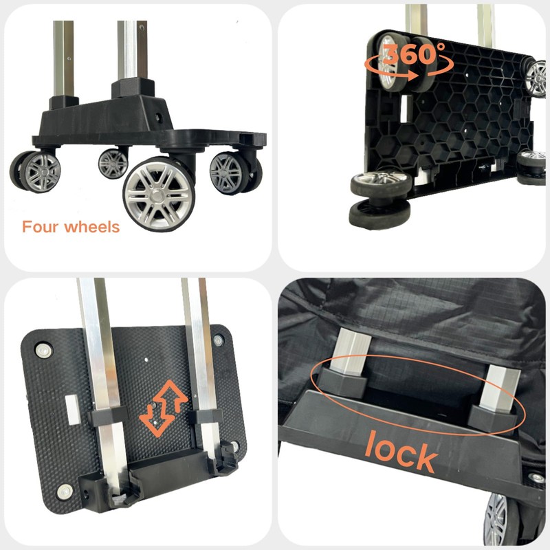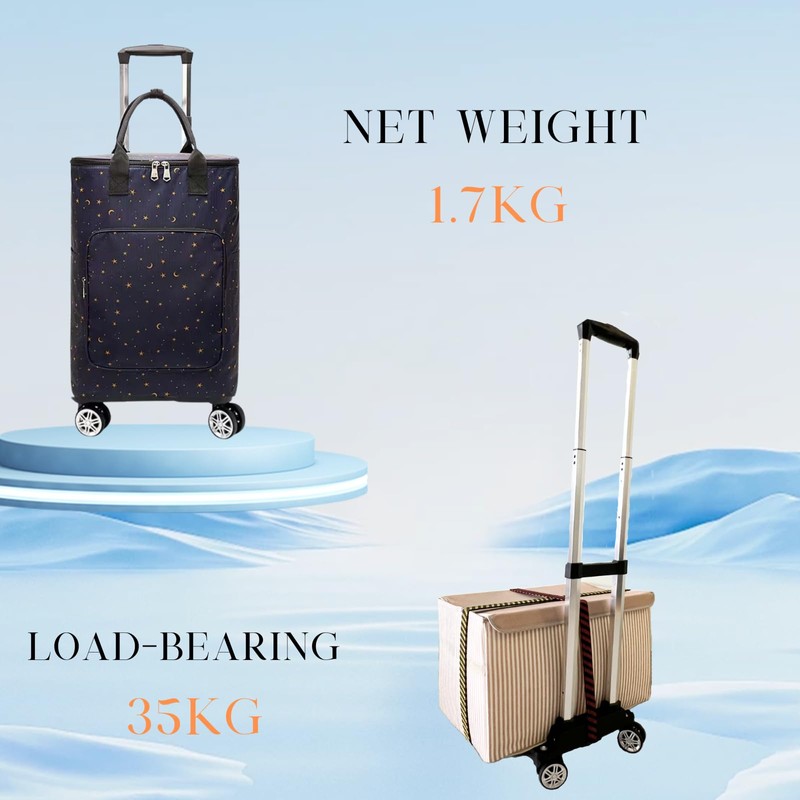 • This trolley is equipped with an insulated bag. It has a strong loading capacity. Foldable and removable. Two storage bags are included.