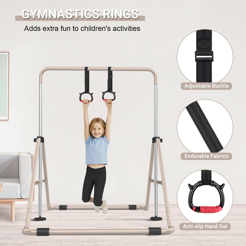 - 【With Gymnastics Rings】:We are delighted to include a set of matching gymnastics rings that easily attach to the bar. These rings add an exciting new aspect to your child's gymnastics routine, fostering physical development, creativity, and endless fun while encouraging playful exploration and skill-building.