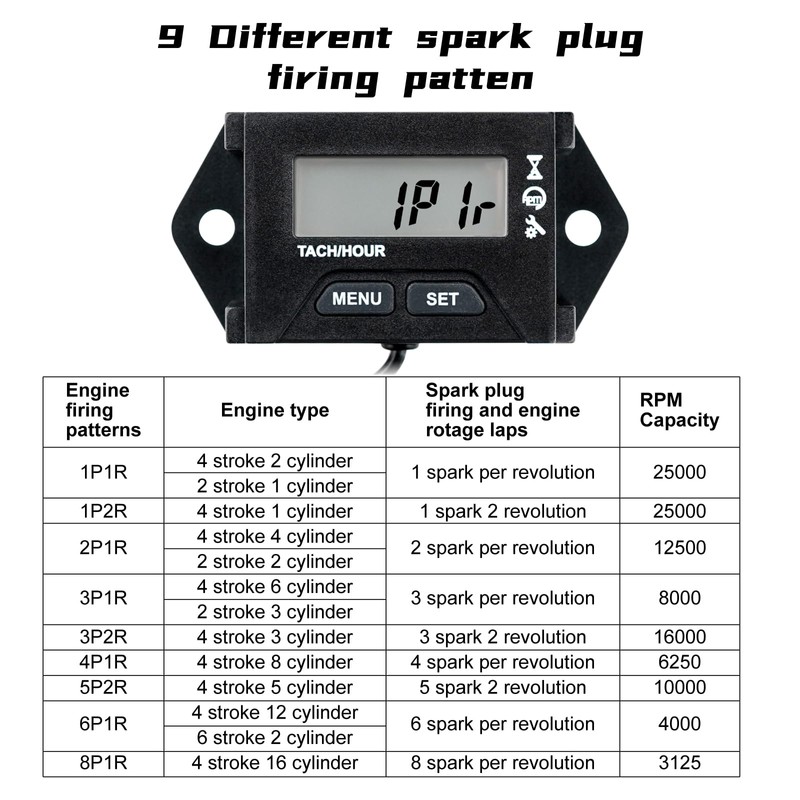 - Multifunctional meter: small engine hour counter, tachometer, maintenance service reminder counter, records speed and operating time for all types of petrol engines, 9 programmable ignition modes.