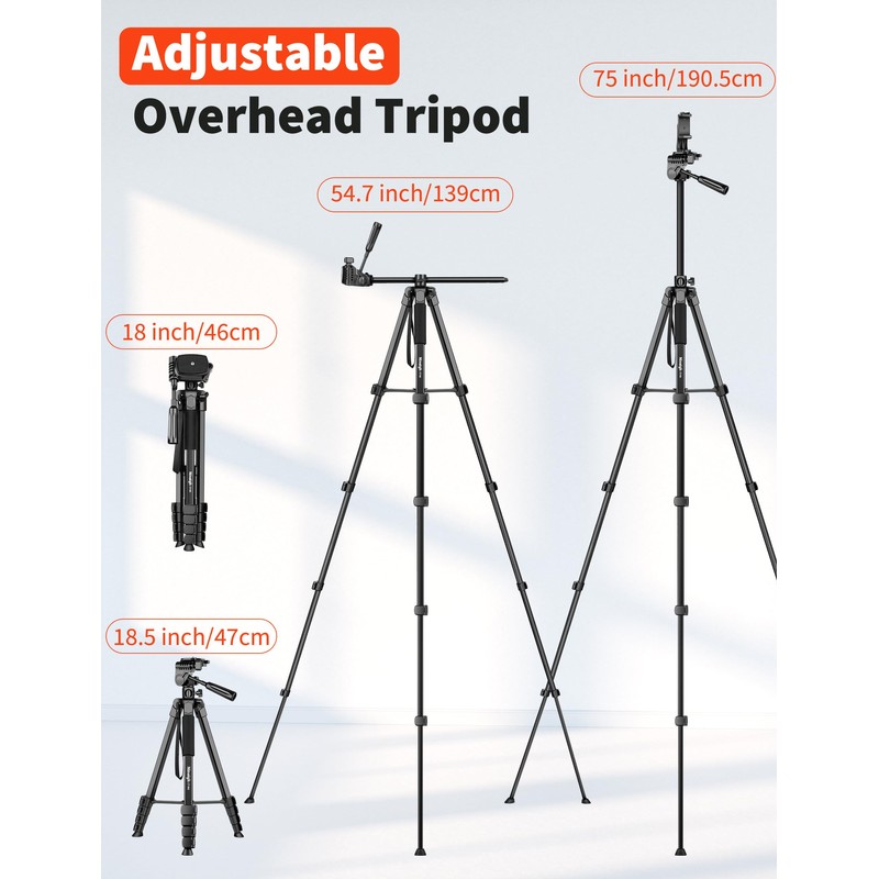 - Stable Overhead Recording TripodTurn your phone tripod into an overhead tripod in just 3 steps! Perfect for kitchen shots, desktop recording, and content creation. The 360 rotating center column paired with 3-way pan head can freely adjust the shooting angle of the phone to complete creative video shooting. It can extend up to 54.7 inches in the overhead mode, which can easily adapt to various shooting scenes and provide stable support for your device.