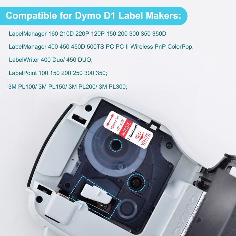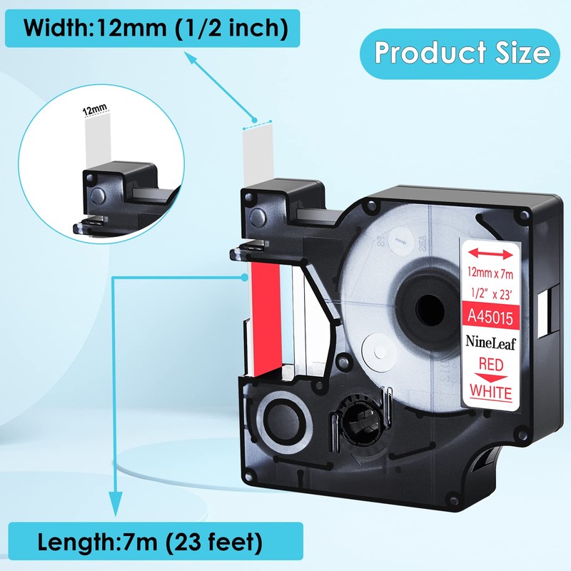 - NineLeaf 6 pack replacement compatible for dymo D1 45015 A45015 S0720550 strong adhesive standard label tape . Color: red on white; Size: 1/2 inch (12mm) x 23 feet (7m).