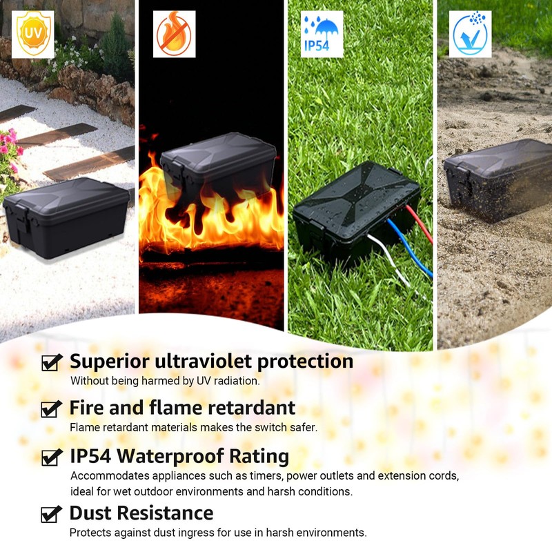 - Versatile Use: Perfect for holiday lights, outlet covers, and plug protectors, this waterproof electrical box ensures safe and reliable outdoor power protection. It’s ideal for applications like garden lighting, pool pumps, Christmas decorations, camping setups, construction site power connections, and more.
