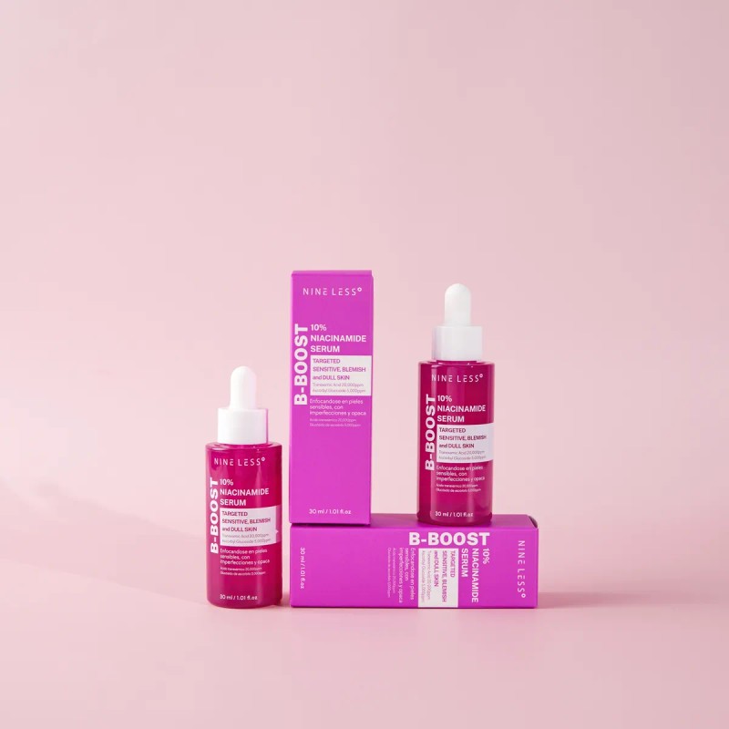 NINE LESS® Suero B-Boost es una sinfonía para tu piel, enriquecido con un 10% de niacinamida, diseñada para iluminar, unificar y suavizar tu rostro. Siente cómo cada gota minimiza los poros y maximiza la luminosidad, revelando un cutis radiante y lleno de vida. 🌿
