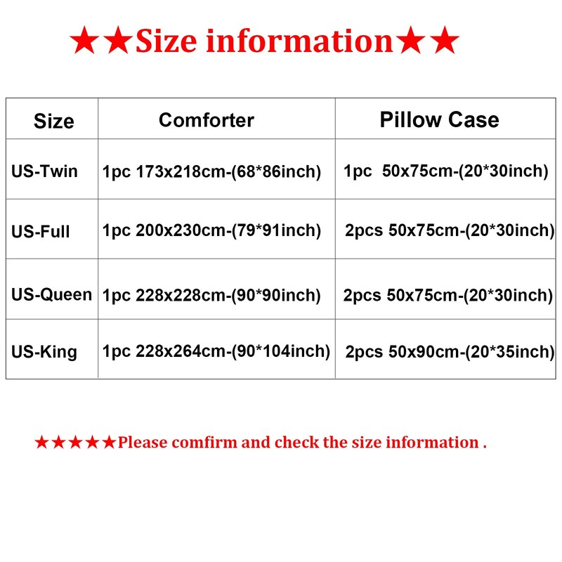 - 【Unique Pattern】This decorative include a comforter and pillowcase.Twin Size (1xcomforter: 68"*86";1x Pillow Case:20"*30"), Full Size (1xcomforter 79"*91"; 2 x Pillow Cases 20"*30" ),Queen Size (1xcomforter 90"*90"; 2xPillow Cases 20"*30" ), King Size (1xcomforter 90"*104";2xPillow Cases 20"*35")