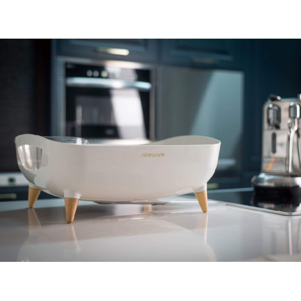 A streamlined, contoured body design expressed in high-glossy, robust colors are modestly exaggerated with wooden-style feet. This stylish appearance adds to the interior design of your kitchen. The 360° rotatable water drain can be adjusted to any direction you wish. The drain is easily detachable for intensive cleaning. The spoon holder is attachable to any part of the dishrack at your convenience. The partitioned structure of each utensil holder helps easy organization of your utensils. The perimeter walls are of 6.7" (17 centimeter) height, providing tableware racking capacity ideal for family of 4-6. The inner, slotted comparment walls are high enough to prevent tipping of plates. Extra design efforts were made for easy assembly. Just "click" the drain to the center hole and you are good to go. Our environmental concerns make Volume Dishwasher as 100% recyclable (ABS.)