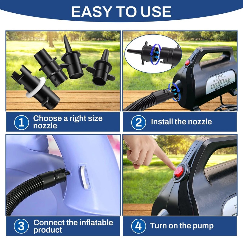 【4 Types of Nozzles】The air pump has 4 different size of nozzles-S, M, L, XL, fits most different inflatables you need. ( NOTE: This air pump is NOT rechargeable and NOT FOR HIGH PRESSURE PRODUCTS, such as Balloons,basketballs,and tyres )