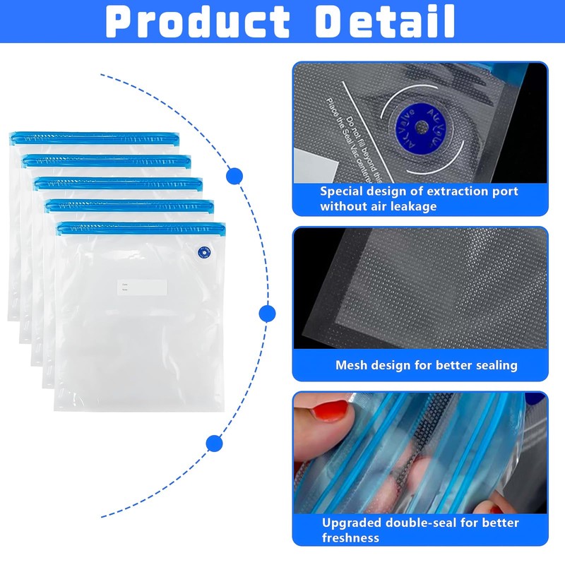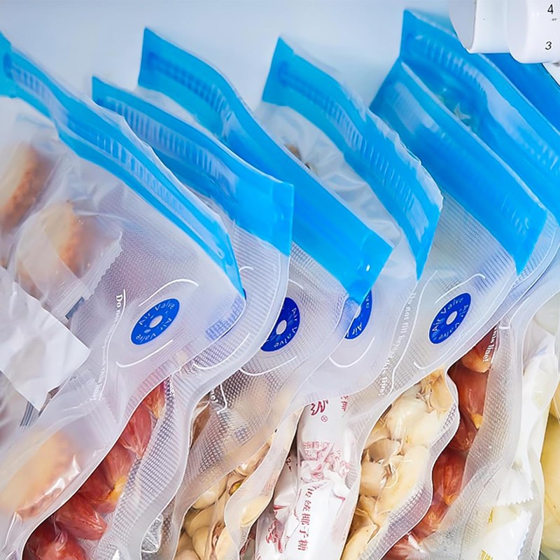 - The two-layer sealing strip and three-layer turbo valve are perfect for removing air. The vacuum bags filament can also keep food fresh for a long time and is very suitable for the cooling storage of solid and semi-solid food products.