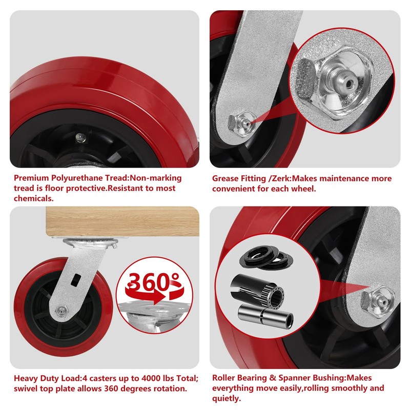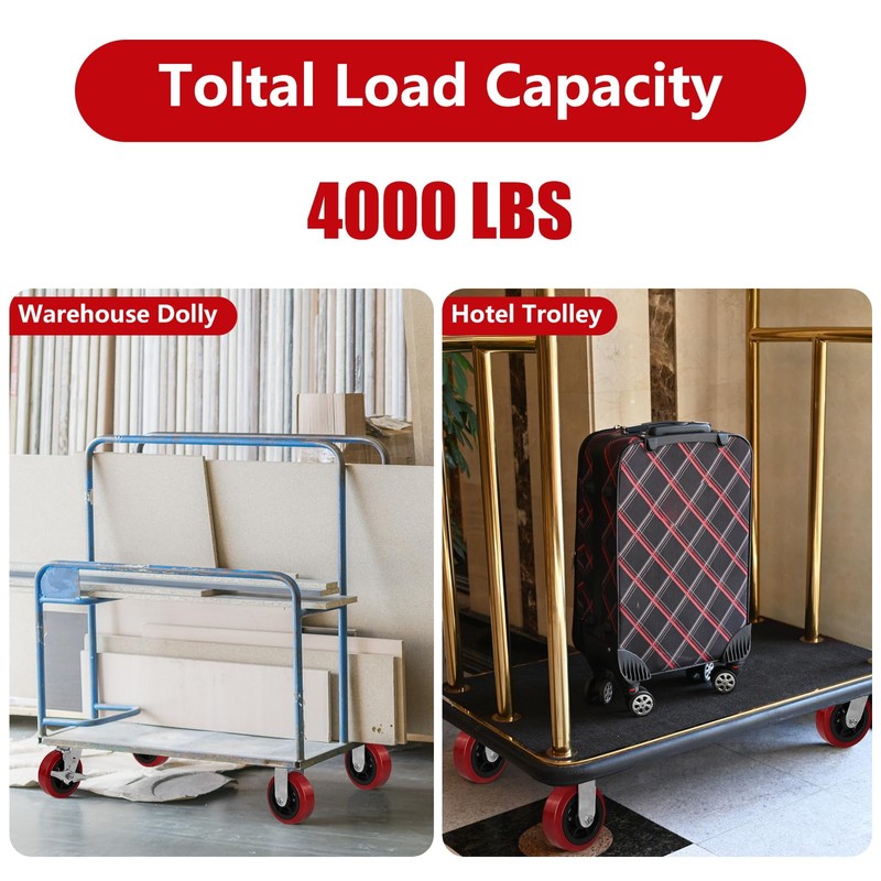 - HEAVY DUTY LOAD: Industrial casters are made of high-quality polyurethane and galvanized thickened yoke, with strong load-bearing capacity. The sturdy material allows you to move heavy loads with ease and safety. Each caster holds a maximum of 1000 lbs.(Sets of 4 load 4000lbs)