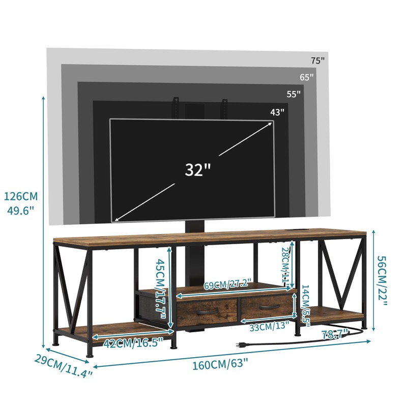 - Ample Storage Space :This TV Stand designed 2 fabric drawers for storing and organizing various items, making them easily accessible.Open shelves with different heights satisfy different storage needs.High shelves on both side can place Audio equipment,xbox or other Higher items.Medium Shelves for store Digital TV Converter Box,TV accessories,books, magazines, CDs, remotes and so on