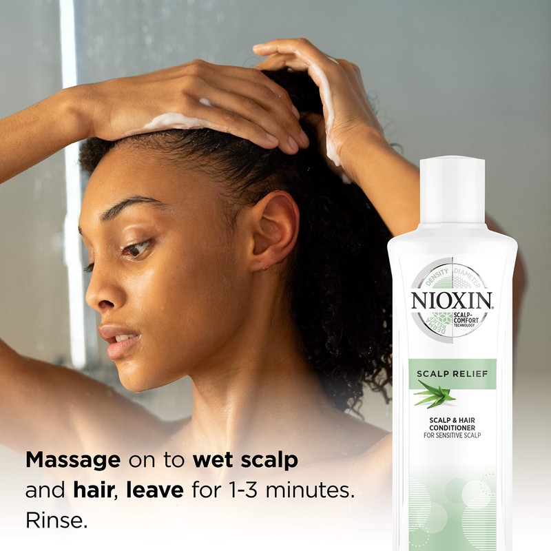 NIOXIN SCALP RELIEF is a complete and gentle scalp and hair care routine, inspired by skin care, which includes 3 steps: 1. Cleanser, to gently cleanse the scalp, 2. Conditioner, to soothe the scalp and leave the hair feeling nourished 3. Leave-on treatment, to provide scalp comfort while helping thicken the hair. With SCALP COMFORT technology, a gentle formula formulated without sulfates and colorants, proven to be suitable for sensitive, dry and itchy scalp. With a clean label fragrance.