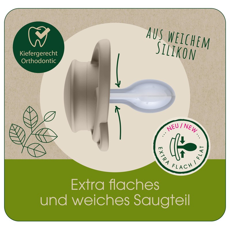- Tooth-friendly suction part: the specially shaped teat made of soft, flexible silicone is particularly tooth-friendly and orthodontic thanks to its extra flat teat shaft.