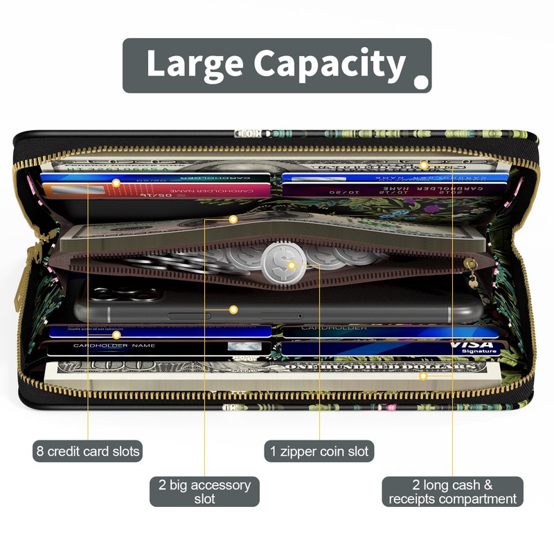- Large Capacity: 7.68 x 4.13 x 0.98 inch, large size and plenty of room. Ladies wallet designed with 8 card slots, 1 zipper coin slot, 2 long cash and receipts compartment and 2 big accessory slot, you can also place your iphone in it