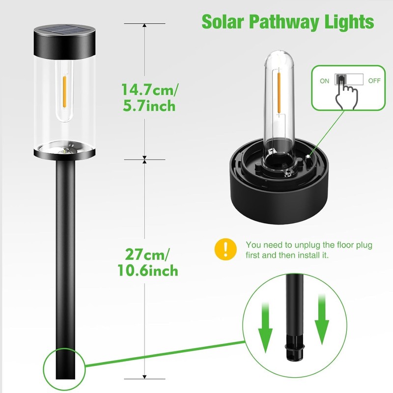 - Quick Installation: Remove the stake from the pole, connect the lawn lights solar powered, turn on the switch under the solar panel, and secure the stake to the ground. No tools and complicated wiring required, simple and time-saving