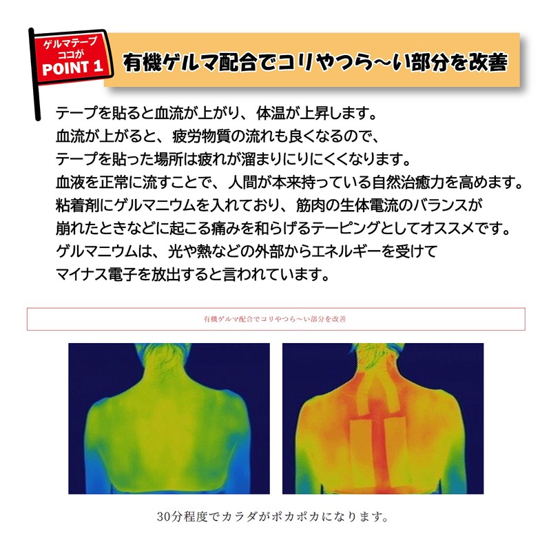 • This germanium tape supports muscle stiffness and soreness by simply cutting it on painful areas
