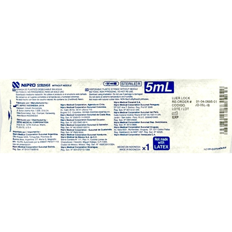 Nipro 100 Jeringas De Plástico 5 Ml Sin Aguja Grado Médico, estériles, de Polipropileno libre de látex