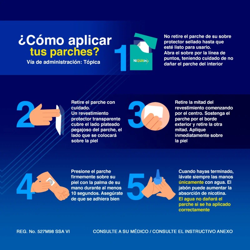 Aplica 1 parche al día sobre piel limpia, seca y sin vello del brazo o torso.