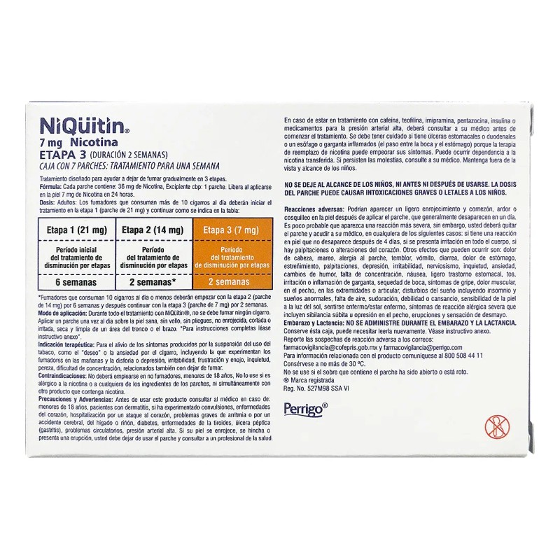 NiQüitin, proporciona una cantidad de nicotina constante durante 24 horas. Este programa de disminución por etapas permite gradualmente suprimir la necesidad de nicotina al cuerpo para dejar este hábito.