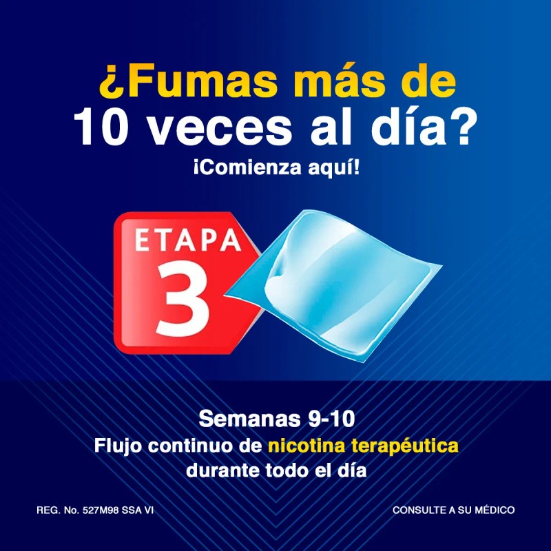 es un tratamiento diseñado para ayudarte a dejar de fumar gradualmente en 3 etapas. Sus presentaciones son parches cuadrados, flexibles de color piel en 3 diferentes concentraciones.