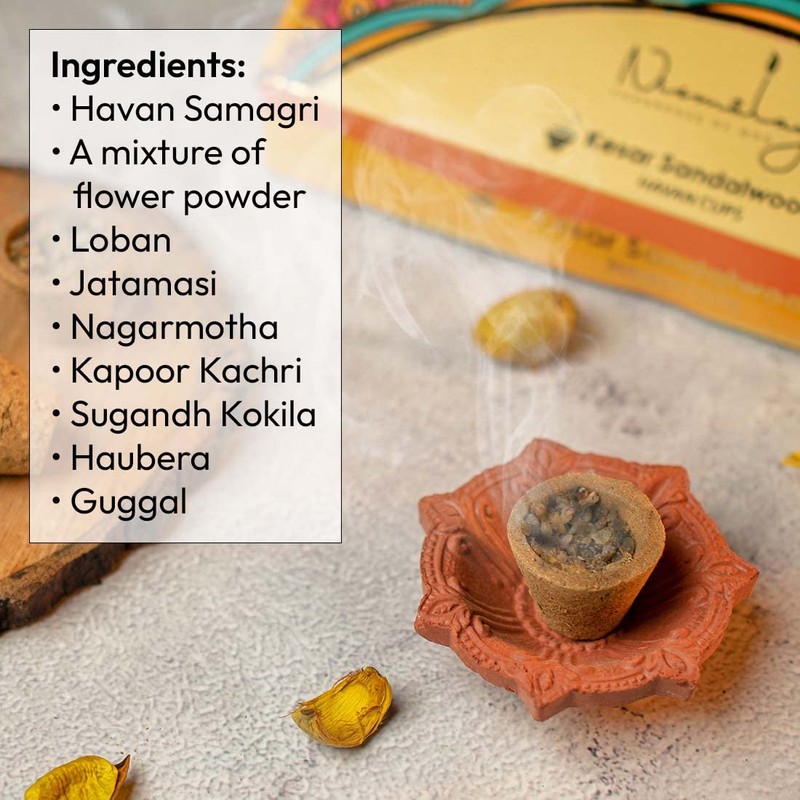 - HAVAN CUPS INGREDOENTS - Havan Samagri, a mixture of flower powder, Loban, Jatamasi, Nagarmotha, Kapoor Kachri, Sugandh Kokila, Haubera & Guggal