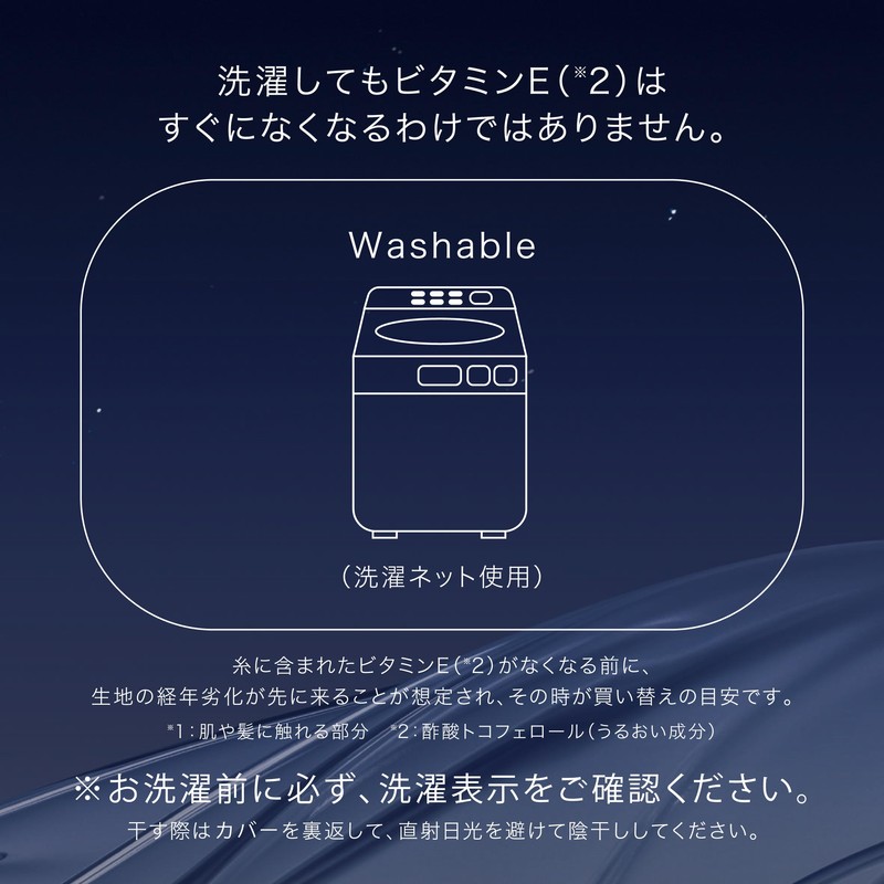 - The moisturizing effect (*1) of Vitamin E (*2) does not disappear immediately after washing. Before the Vitamin E (*2) in the thread is gone, it is estimated that the fabric will deteriorate first, and this is an estimate for replacement